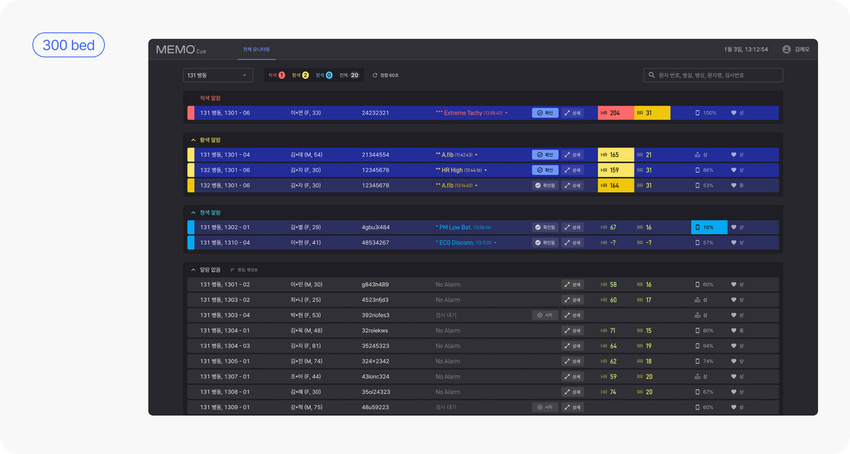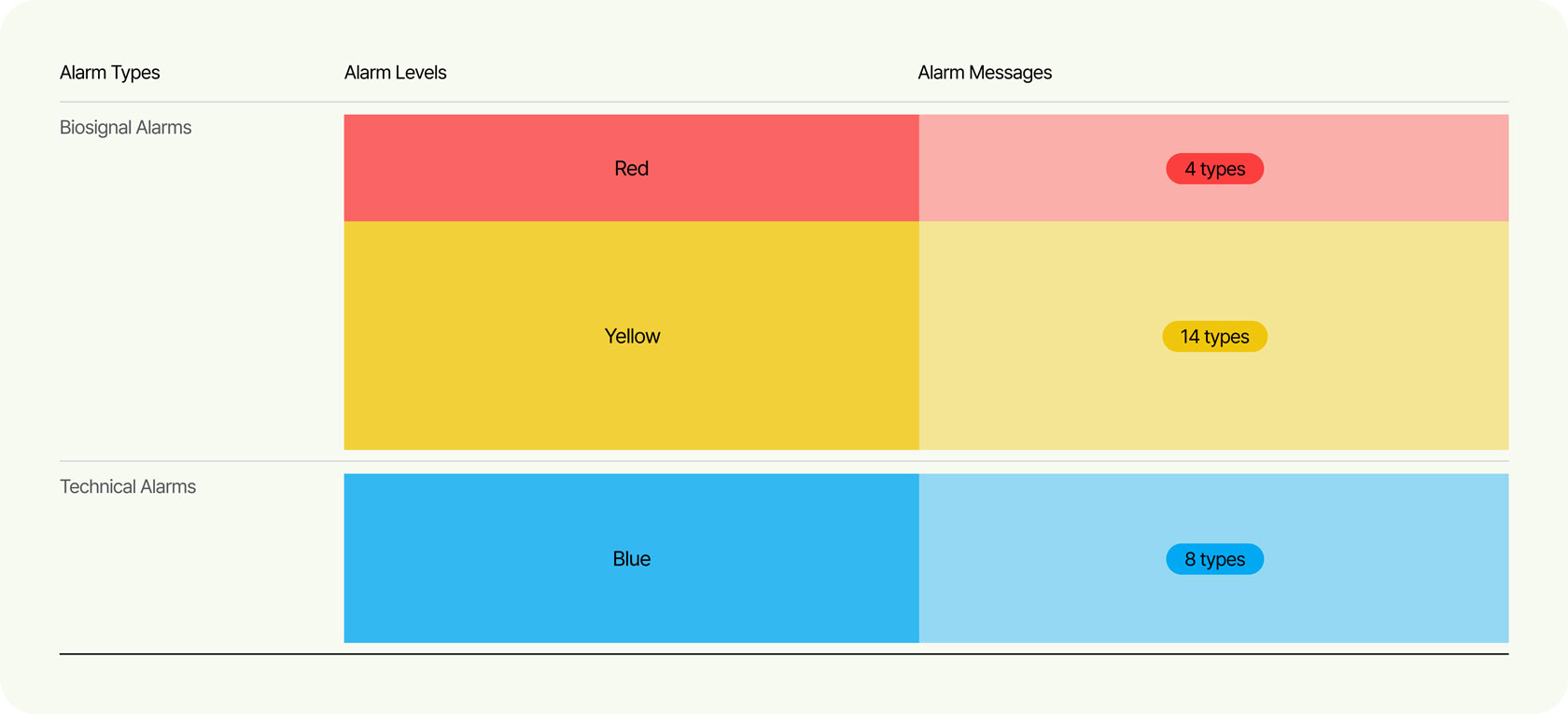 Prioritized management of patients with abnormal signs using color-coded alarms (red, yellow, blue)